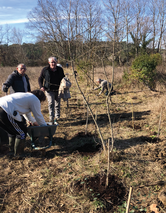 Bassin de rétention du Viala : enlèvement des bâches plastiques et plantation d’arbres de haute tige.