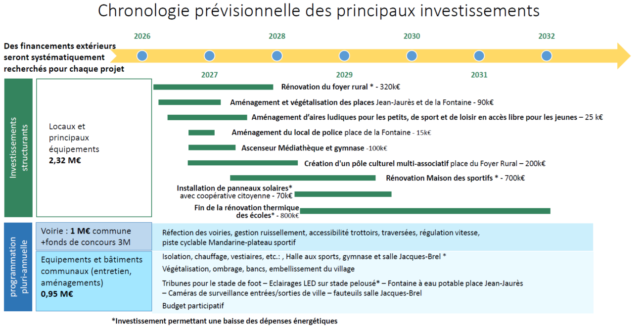Certaines actions impliquent un budget de fonctionnement (par exemple le recrutement d’un policier et d’un ASVP et le recours au dispositif aidé d’emploi de services civiques solidarité seniors). D’autres actions, ciblant les équipements et infrastructures de la commune, relèvent du budget d’investissement. Ce budget sera abondé principalement par l’autofinancement dégagé chaque année au niveau de la section de fonctionnement et par les subventions, qui sont systématiquement recherchées. La projection budgétaire sur le mandat 2026-2032 est basée sur une hypothèse de stabilité des taux d’imposition. Le budget mobilisable pour l’investissement est estimé à 3,5 M€ auxquels s’ajoute la compensation de la TVA versée 2 années après réalisation des investissements.